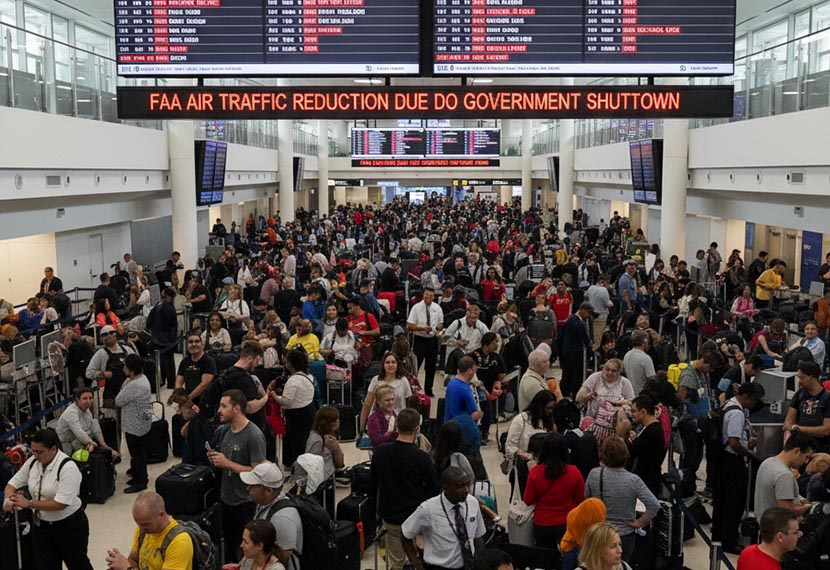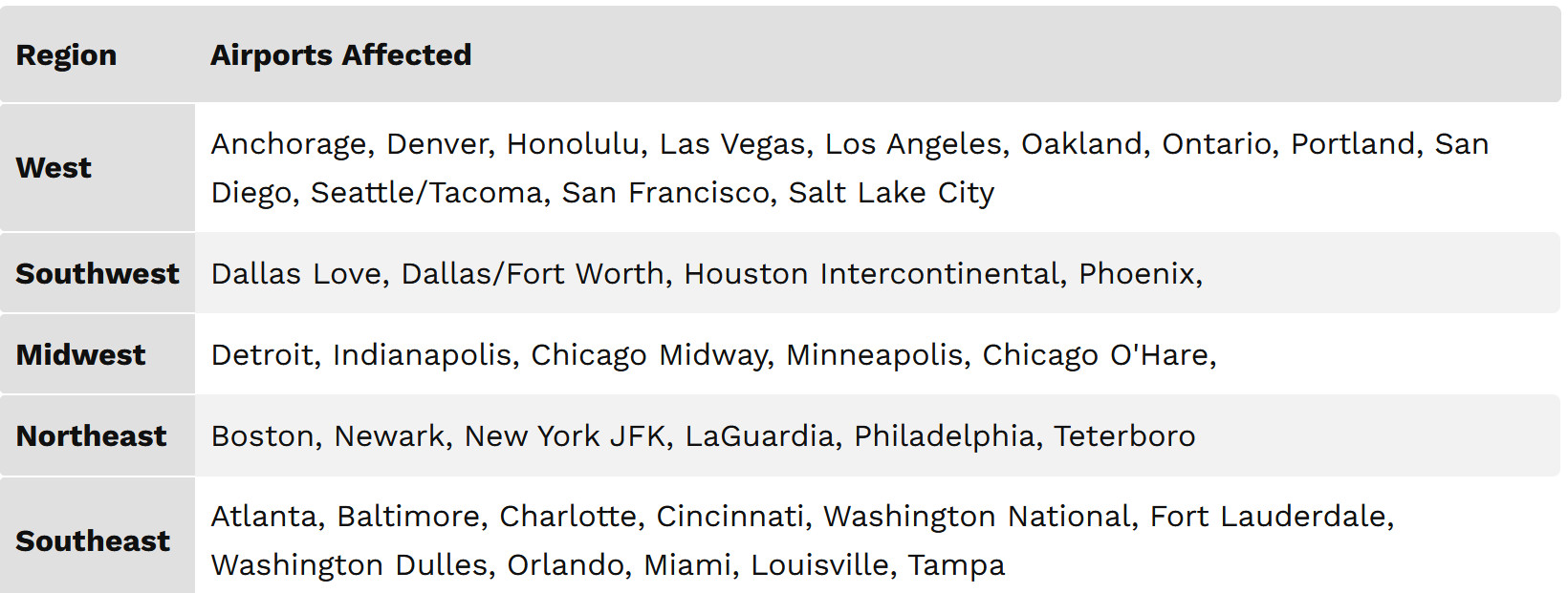 ผลกระทบจากการที่รัฐบาลสหรัฐอเมริกา (สมัยประธานาธิบดีโดนัลด์ ทรัมป์ 2) ได้ปิดการทำงานของรัฐบาลบางส่วน (Shut down) จากปัญหางบประมาณไม่ผ่านรัฐสภา เที่ยวบินหลายพันเที่ยวบินถูกยกเลิกหรือล่าช้าทั่วสหรัฐอเมริกา หลังจากที่รัฐมนตรีว่าการกระทรวงคมนาคมสหรัฐฯ ได้ดำเนินการอย่างที่ไม่เคยเกิดขึ้นมาก่อน โดยสั่งลดเที่ยวบินประจำลงถึง 10% เพื่อลดแรงกดดันต่อเจ้าหน้าที่ควบคุมการจราจรทางอากาศในช่วงที่รัฐบาลกลางปิดทำการ