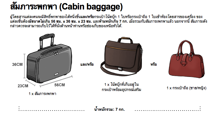 ถ้ากระเป๋าใหญ่และหนัก ก็สามารถโหลดเข้าเก็บในส่วนใต้ท้องเครื่องได้อยู่แล้ว และมีขนาด/น้ำหนักตามที่สายการบินกำหนด เช่น 15 – 20 กิโลกรัม ถ้าน้ำหนักเกินก็ต้องจ่ายค่าระวางเพิ่ม บางคนลากกระเป๋าใบ่ใหญ่โตมาจากหน้าสนามบินขึ้นบนเครื่องได้ แต่พอจะยกขึ้นเก็บดันเป็นโรคอ่อนแรงกระทันหันซะงั้น ที่ร้ายกว่านั้นขนาดมันใหญ่เกินกว่าที่จะยัดลงในช่องเก็บของได้ แน่นอนพนักงานก็ต้องให้คุณไปทำเรื่องโหลดเข้าใต้ท้องเครื่องก่อน เสียทั้งเวลาและอารมณ์ด้วยกันทั้งสองฝ่าย บางทีถึงขั้นต้องบินกับเที่ยวบินอื่นเลยก็มี เพราะไม่ทันเวลา (หัดอ่านระเบียบเสียบ้างนะ เขาติดตั้งป้ายแจ้งที่ขุดเช็กอินชัดเจนแบบข้างล่างนี้) เห็นชัดไหม?