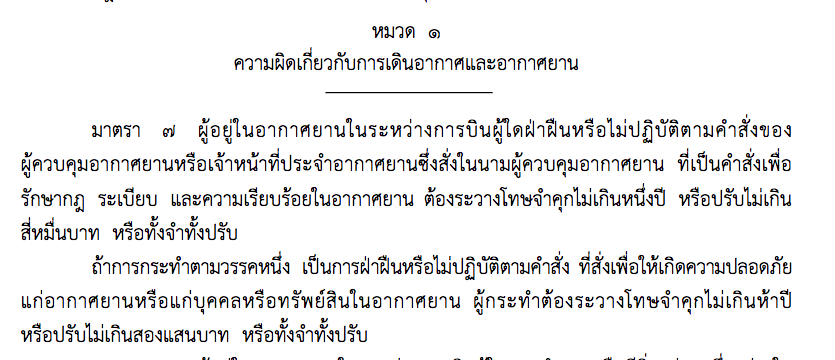 ก่อนจะคุยต่อ อยากให้ท่านคลิกไปอ่าน พระราชบัญญัติว่าด้วยความผิดบางประการต่อการเดินอากาศ พ.ศ. ๒๕๕๘ ก่อน หรือจะเซฟเก็บไว้เป็นคู่มือการเดินทางด้วยเครื่องบินก็ได้ คือการเดินทางด้วยเครื่องบินนี่มันต่างจากการใช้บริการรถโดยสารประจำทาง หรือ รถไฟ นะครับ เริ่มตั้งแต่การเช็กอินซึ่งมีรายละเอียดความปลอดภัยกำกับมากมาย มีนานาข้อห้าม เพื่อความปลอดภัยทั้งต่อตนเองและผู้โดยสารอื่นๆ อย่าลืมว่า “ถ้าขาเราพ้นจากพื้นดินแล้ว อะไรๆ ก็อันตรายทั้งนั้น ต้องปลอดภัยไว้ก่อน” ต้องเชื่อฟังเจ้าหน้าที่ประจำอากาศยาน (แอร์โฮสเทสและสจ๊วต) ผู้ควบคุมอากาศยาน (กัปตันและผู้ช่วยนักบิน) เพื่อความปลอดภัย