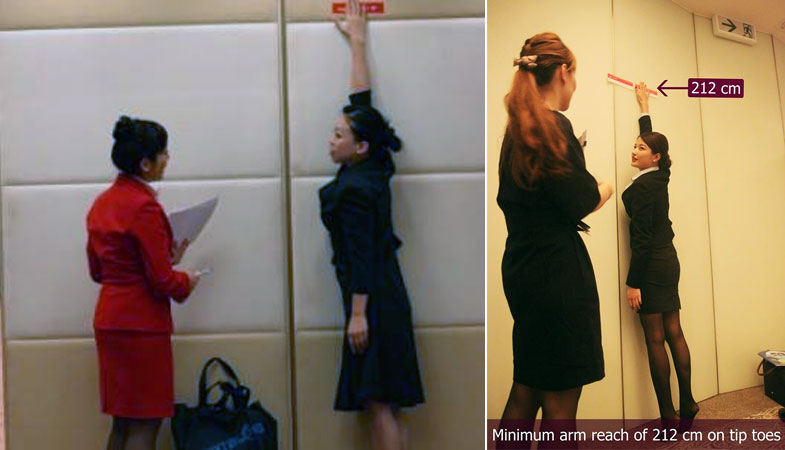 สำหรับคนที่มีความสูงเกินกว่า 165 เซนติเมตรขึ้นไป ก็ยินดีด้วยครับ คุณสามารถสมัครได้ทุกสายการบินแบบครอบจักรวาล สำหรับสุภาพบุรุษสายการบินส่วนมากจะรับที่ 170 เซนติเมตรขึ้นไป มีบางสายรับน้อยกว่านั้น แต่ก็ไม่ต่ำกว่า 165 เซนติเมตร สำหรับคุณผู้หญิงนั้น บางสายการบินไม่ได้กำหนดส่วนสูงไว้ แต่กำหนดให้ต้องเอื้อมแตะให้ถึงที่ระยะ 208 – 212 เซนติเมตร (เขย่งจิกเท้าแบบบัลเลย์ได้ ความสูงนี้คือระยะสูงสุดของตู้เก็บสัมภาระเหนือศรีษะที่นั่งผู้โดยสารครับ ถ้าได้ขึ้นเครื่องก็ลองยกฝาปิดขึ้นดูทำได้สะดวกไหม? ต้องเขย่งเท้าบ้างไหม?) สำหรับท่านที่ความสูงไม่ถึง 160 ก็คงต้องรอสมัครเฉพาะสายการบินที่กำหนดให้เอื้อมแตะถึงแบบนี้ ไปลองหัดเอื้อมแตะดูว่าพอจะ OK ไหม?