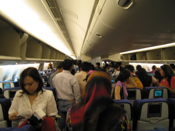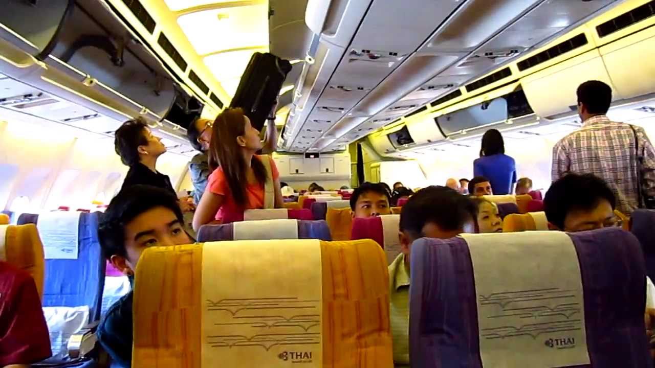 แอร์และสจ๊วตมีไม่ถึง 30 คนต่อผู้โดยสารลำใหญ่ๆ กว่า 500 คน คงจะช่วยท่านไม่ไหวครับ กระดูกสันหลังคงพังไปก่อนได้บริการอาหารและเครื่องดื่ม ส่วนท่านที่เกิดมาตัวล่ำเตี้ย เอื้อมไม่ถึงก็อาจขอร้องให้ผู้โดยสารอื่นช่วยได้ ซึ่งก็ไม่เคยพบการปฏิเสธนะ ถ้าคิดว่าหนักยกไม่ไหวก็โหลดใต้ท้องเครื่องนะครับ - มองด้านหลังสักนิด ก่อนเก็บกระเป๋าบนหิ้งเหนือศรีษะ ตอนขึ้นเครื่องนี่แหละครับ ที่เป็นจังหวะที่เราต้องยกกระเป๋าขึ้นไปเก็บ เมื่อเดินมาถึงแถวที่นั่งของตัวเอง แต่ก่อนยก แนะนำให้ชำเลืองมองด้านหลังเราสักหน่อยครับ ว่ามีผู้โดยสารจะเดินเลยแถวเราไปบ้างไหม ถ้ามีก็เปิดทางให้เขาเดินไปก่อนเถอะ อย่าให้การยกของไปเก็บของเรานั้นขวางทางเดิน จนกระทบต่อแถว boarding ผู้โดยสารข้างหลังครับ คุณอาจจะเป็นส่วนหนึ่งที่ทำให้เครื่อง delay โดยไม่รู้ตัวก็ได้นะ (แล้วคุณก็จะมาด่าสายการบินทีหลัง ว่าทำไมเครื่องถึง delay เช่นนี้)