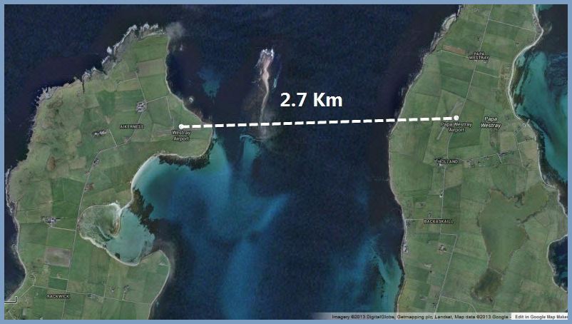 สายการบิน Loganair ของสกอตแลนด์ เป็นผู้จัดการบินเส้นทางนี้ โดยเครื่องบินลำเล็กที่มีที่นั่งเพียง 8 ที่นั่งเท่านั้น ปกติแล้วจะใช้เวลาเดินทางประมาณ 2 นาที แต่หากมีลมช่วยพัดส่งล่ะก็ มันจะใช้เวลาสั้นลงเพียง 47 วินาทีเท่านั้น เครื่องบินก็ถึงจุดหมายปลายทาง (และก็ไม่จำเป็นต้องมีบริการอาหาร-เครื่องดื่มด้วย ก็เร็วขนาดนั้นใครจะเสิร์ฟทัน ผู้โดยสารพกเครื่องดื่มมาเองยังเปิดกระป๋องดื่มไม่หมดเลย)